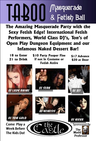 A chance to come out and enjoy A Magical Halloween with the adults before the kids and amateurs hit the streets. Taboo 5 will be the sexiest event of the year giving you a chance to see International Fetish Performers, play with open Dungeon Equipment and dance all night to our World Famous DJ’s. The very best fetish and burlesque performances to dazzle and excite you, including StrykerVawn from Austin Texas, Oni & Jody from Atlanta Georgia and Thee VaudeVillians Burlesque Troupe! Rock your body all night long with world class DJ’s, including DJ Lady Anime, DJ Jet, DJ Neiva, DJ Nemesis and Castle Residents DJ Tom Gold and DJ Sean! No rest for the wicked!