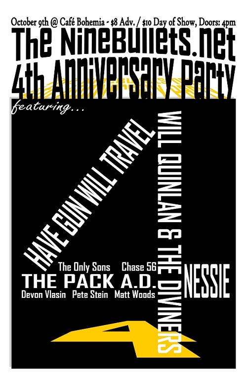 ninebullets.net 4th Anniversary Party promises to be a pretty epic night full of music, booze and maybe even some tacos. The show will be all ages and will be over early enough to get any youngsters in bed before the real crazy begins. Tickets for the show will cost 8 dollars in advance and 10 dollars day of.